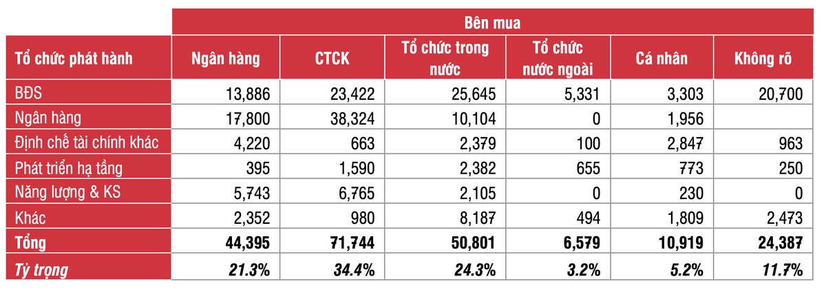 Các tổ chức trong nước khác mua 50,8 nghìn tỷ đồng, chiếm 24,3% bao gồm các công ty bảo hiểm, các quỹ đầu tư chứng khoán.