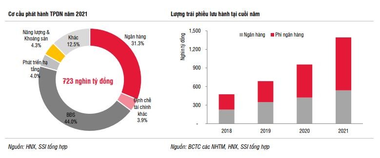 Trong báo cáo mới đây, SSI Research chỉ ra, năm 2021, các doanh nghiệp phát hành tổng cộng 722.700 tỷ đồng trái phiếu, tăng 56% so với năm 2020. Số trái phiếu doanh nghiệp phát hành ròng 2021 (lượng phát hành trừ đi lượng đáo hạn và mua lại trước hạn) ước tính là 438.000 tỷ đồng, tăng 63% so với lượng phát hành ròng năm 2020.