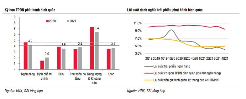 Kỳ hạn bình quân của trái phiếu doanh nghiệp phát hành năm 2021 giảm xuống 3,86 năm từ mức trung bình 4,32 năm của 2020. Nguyên nhân chủ yếu do trái phiếu nhóm ngân hàng và bất động sản đều có kỳ hạn ngắn hơn lần lượt 0,5 năm và 0,3 năm, về mức 4,2 năm và 3,6 năm. Nhóm năng lượng và khoáng sản cũng có kỳ hạn ngắn hơn 0,86 năm xuống bình quân 6,4 năm và vẫn là nhóm có kỳ hạn dài nhất.
