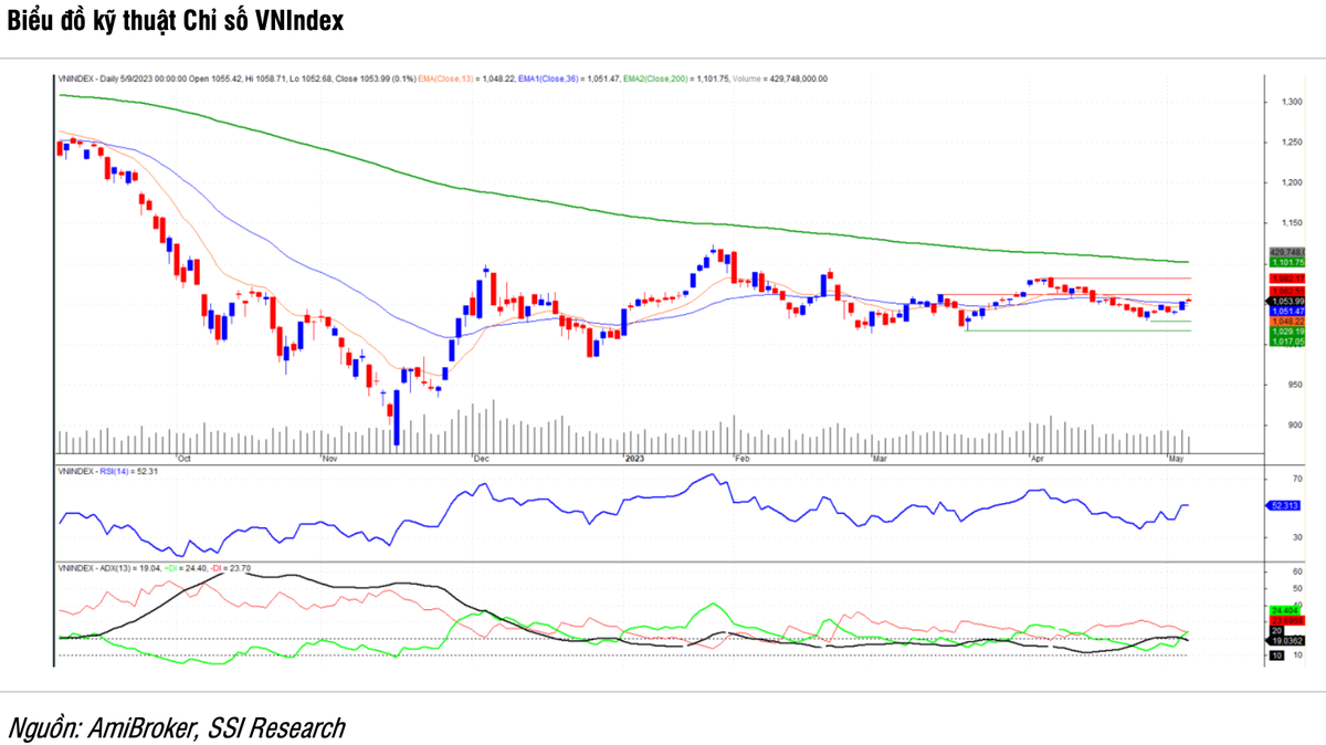 Theo góc nhìn kỹ thuật, thị trường vẫn sẽ tiếp tục dao động rung lắc trong biên độ từ cận trên 1.060 - 1.070 đến cận dưới 1.017 - 1.020. Trong quá trình đi ngang của thị trường ở chu kỳ tháng 5, sẽ có những nhịp rung lắc mạnh và đây là cơ hội để nhà đầu tư tích lũy dần cổ phiếu khi chỉ số VN-Index tiệm cận vùng biên dưới 1020. Đồng thời, gia tăng tỉ trọng danh mục những cổ phiếu tốt, có nền tích lũy chắc chắn trên vùng hỗ trợ của chính cổ phiếu đó hoặc áp lực giảm nhẹ hơn so với thị trường.