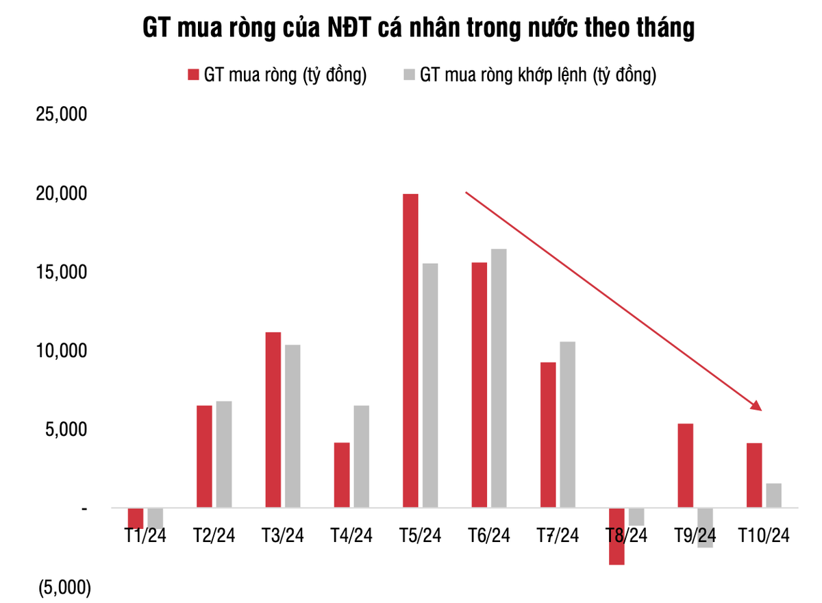 Dòng tiền thiếu hụt giữa bối cảnh lực nâng đỡ của nhà đầu tư cá nhân trong nước trở nên hạn chế khi phải hấp thụ lượng lớn cung bán ra từ khối ngoại. Tính chung, nhóm nhà đầu tư cá nhân trong nước đã mua ròng tổng cộng 4.100 tỷ đồng trong tháng 10 và hơn 71.000 tỷ đồng kể từ đầu năm.