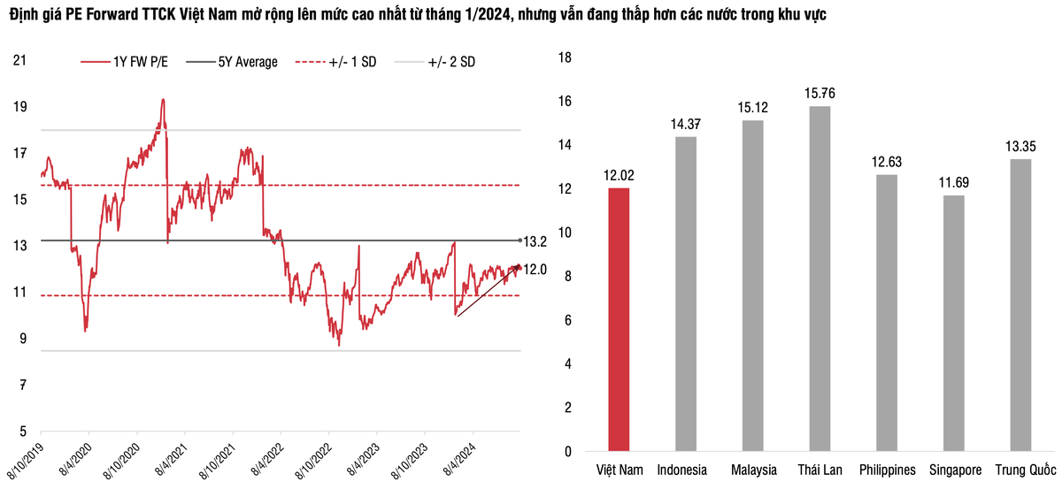 P/E ước tính 1 năm của VN-Index tăng lên 12 lần vào ngày 04/10/2024, cao nhất từ cuối tháng 1/2024, phản ánh kỳ vọng tăng trưởng lợi nhuận cho giai đoạn nửa cuối 2024 và năm 2025. Dù vậy, định giá thị trường Việt Nam vẫn thấp hơn so với một số thị trường khu vực Đông Nam Á, một trong các điểm mấu chốt để cạnh tranh thu hút trở lại dòng vốn ngoại.