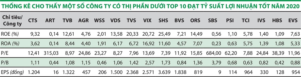 Với tỷ suất lợi nhuận trên vốn chủ sở hữu đạt trên 10% hiện nay và giá cổ phiếu trên giá trị sổ sách khoảng 1 - 1,3 lần, nhóm công ty chứng khoán dưới Top 10 đang có cơ hội thuận lợi để huy động vốn. Tuy nhiên, cạnh tranh sẽ gia tăng sau khi hệ thống phần mềm giao dịch mới của HOSE được đưa vào hoạt động, các công ty chứng khoán Top 10 bỏ lại sau lưng rào cản nghẽn lệnh, sẽ gia tăng thị phần.