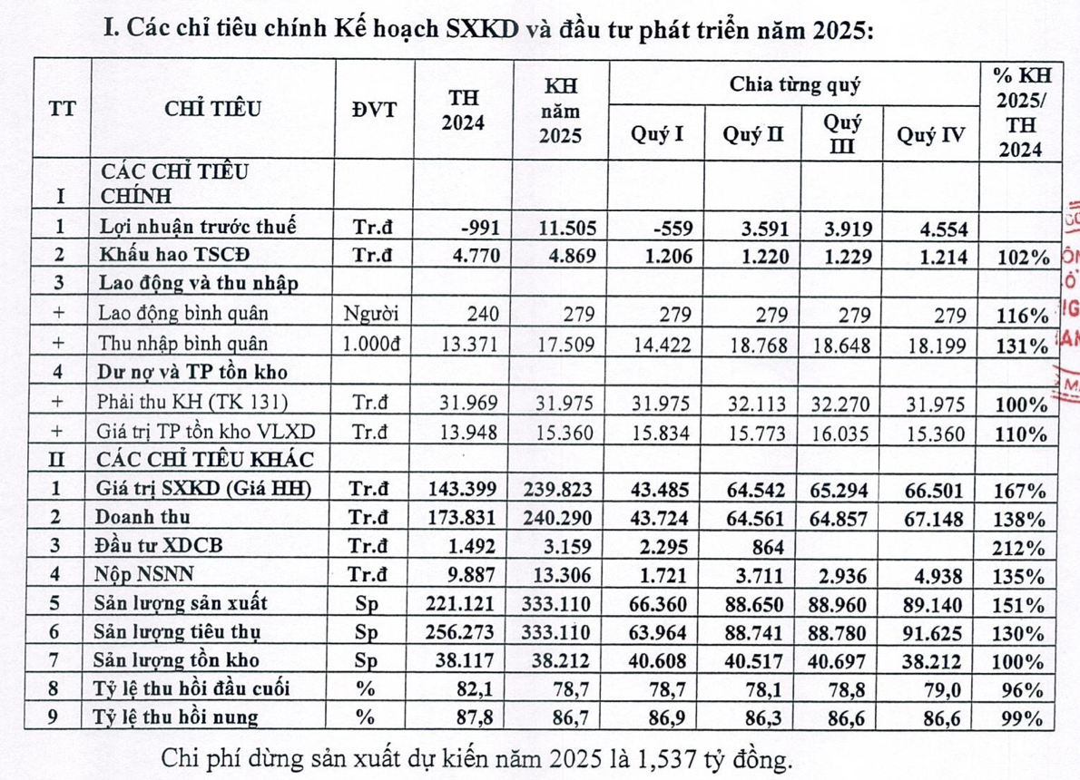 Theo dự thảo tài liệu Đại hội, Công ty cho biết, năm 2025 đặt mục tiêu doanh thu đạt hơn 240,2 tỷ đồng, tăng 38% so với thực hiện của năm 2024, trong đó doanh thu phần sứ là hơn 188 tỷ đồng, tăng 47%; lợi nhuận trước thuế đạt 11,5 tỷ đồng, cải thiện mạnh mẽ so với khoản lỗ 991 triệu đồng năm 2024. Dư nợ phải thu kế hoạch năm 2025 là 31,97 tỷ đồng (tương đương năm 2024).