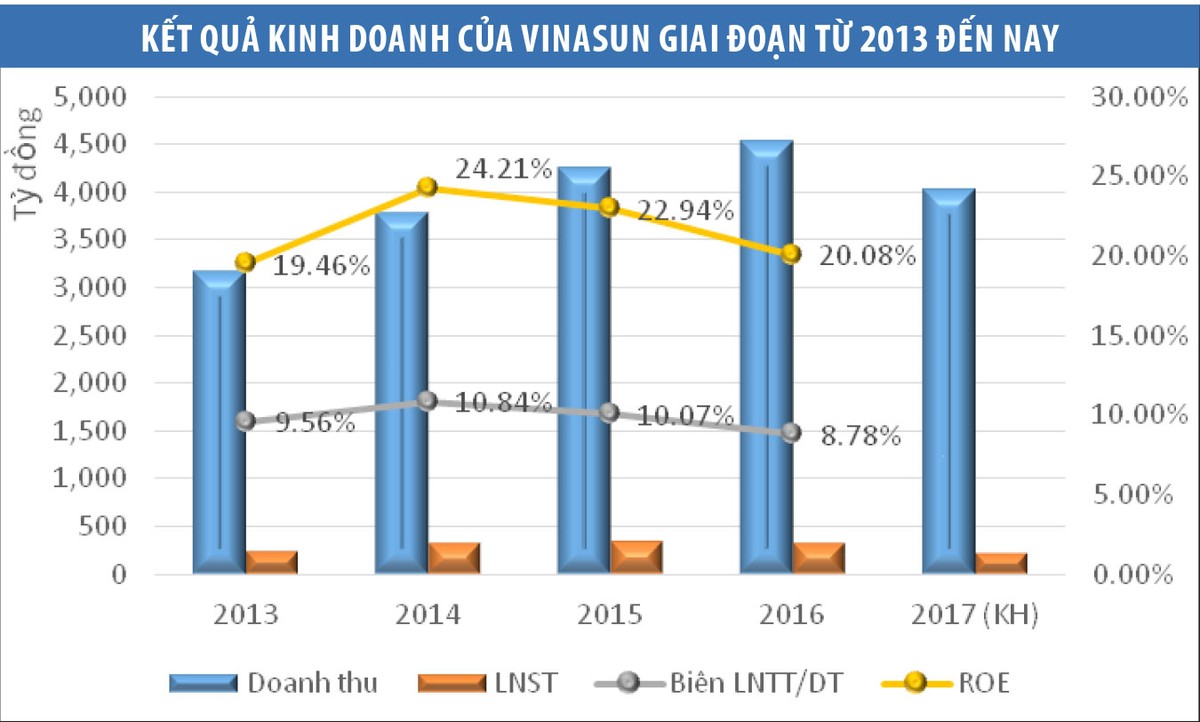 Mới đây, Vinasun đã công bố tài liệu Đại hội đồng cổ đông năm 2017 với chỉ tiêu doanh thu 4.025 tỷ đồng, lợi nhuận trước thuế 256 tỷ đồng, giảm lần lượt 11% và 35,5% so với thực hiện 2016.