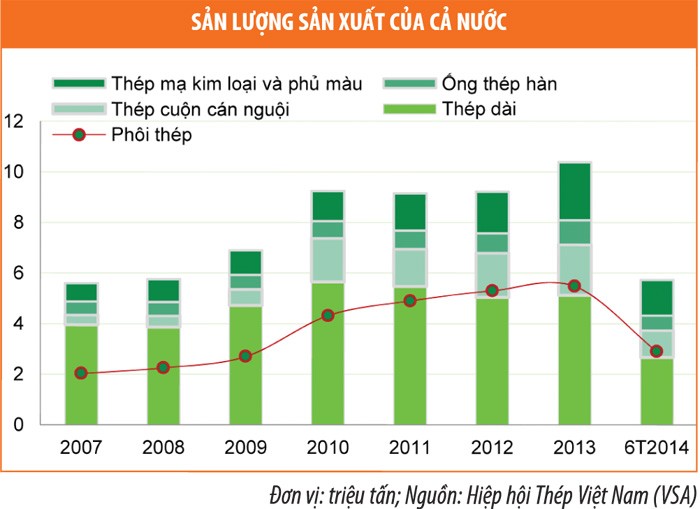 Trong 6 tháng đầu năm 2014, sản lượng sản xuất thép xây dựng của các thành viên trong Hiệp hội Thép Việt Nam (VSA) đạt 2,440 triệu tấn, tăng 8,1% so với cùng kỳ năm trước, trong khi sản lượng tiêu thụ đạt 2,462 triệu tấn, tăng 8,4% so với cùng kỳ năm 2013. Trong đó, sản lượng tiêu thụ đạt mức khá thấp trong 2 tháng đầu năm, tăng lên mức cao nhất vào tháng 3 khi cả nước bước vào mùa xây dựng và bắt đầu giảm dần từ tháng 4.