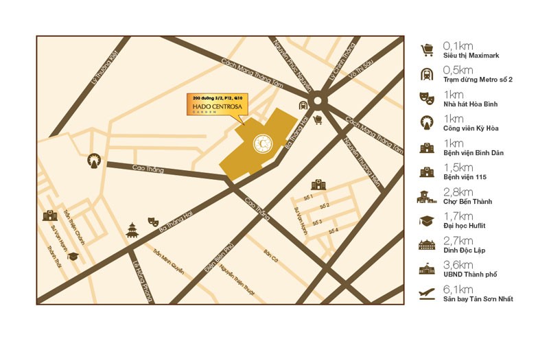 Hado Centrosa Garden tọa lạc tại mặt tiền đường Ba tháng Hai, chỉ cách chợ Bến Thành 10 phút di chuyển