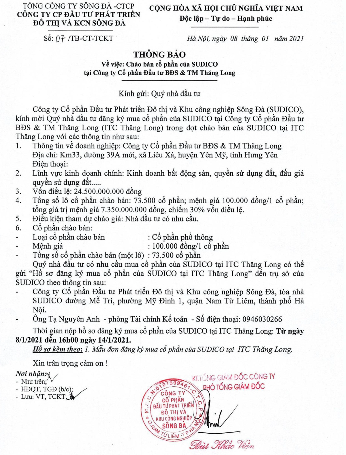 Tin liên quan Công ty cổ phần Phụ gia Nhựa thông báo phát hành cổ phiếu ra công chúng 08/01/2021 12:19 Công ty tài chính trách nhiệm hữu hạn một thành viên Bưu Điện thông báo sửa đổi, bổ sung nội dung Giấy phép thành lập và hoạt động 08/01/2021 08:00 Công ty cổ phần Thực phẩm Sao Ta thông báo phát hành cổ phiếu ra công chúng 08/01/2021 07:00 Công ty cổ phần Đầu tư và Công nghệ HVC thông báo phát hành cổ phiếu ra công chúng 07/01/2021 12:54 Từ khóa Công ty cổ phần Đầu tư Bất động sản & Thương mại Thăng Long