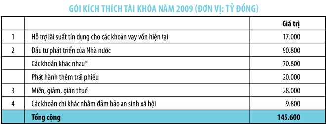 Trước tác động của khủng hoảng tài chính và suy thoái kinh tế toàn cầu đối với tăng trưởng kinh tế trong nước, từ cuối năm 2008, Chính phủ đã ban hành Nghị quyết 30/2008/NQ-CP tập trung vào những giải pháp cấp bách nhằm ngăn chặn suy giảm kinh tế. Việt Nam đã thực hiện gói kích thích tài khóa với tổng giá trị 145.600 tỷ đồng (tương đương 8 tỷ USD, hoặc 8,7% GDP).