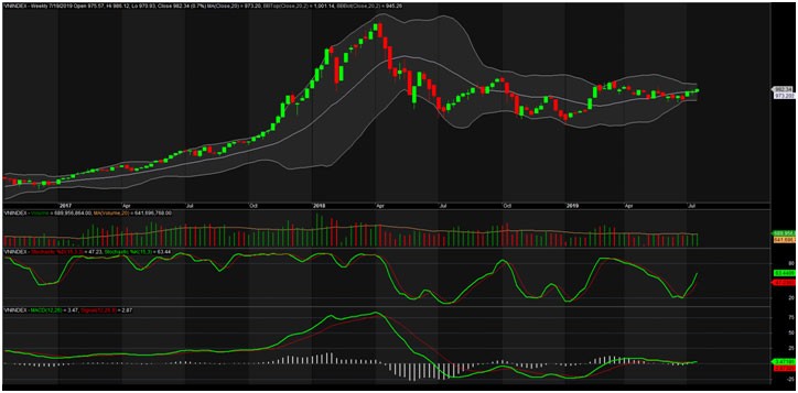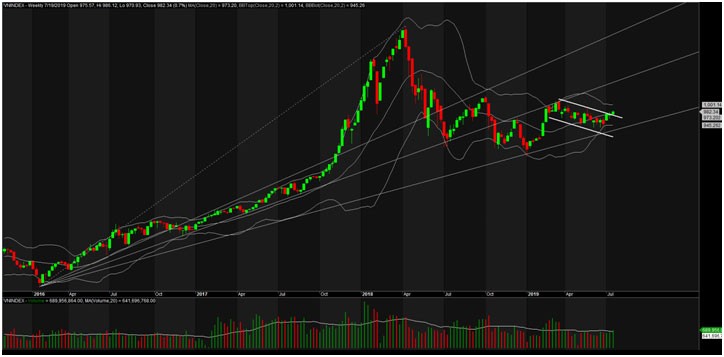 Kết thúc tuần giao dịch thứ 3 của tháng 7 (15 - 19/7), VN-Index chốt ở 982,34 điểm. Tuy cả tuần chỉ tăng 0,7% với biên độ dao động tầm 15 - 16 điểm, không nhiều, nhưng cũng khẳng định chỉ số vẫn đang vận động tích cực. Để làm rõ hơn, chúng ta cùng review lại chỉ số ở các Timeframe (khung thời gian) dài hơn, giúp nhà đầu tư có cái nhìn toàn cảnh trên quan điểm phân tích kỹ thuật.