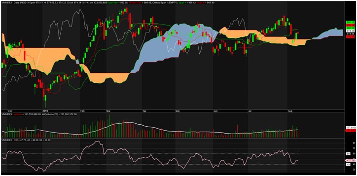 Với hệ thống Ichimoku, cả đường Tenkan và Kijun hiện tại đang có giá trị bằng nhau (980,58) và cùng đóng vai trò là ngưỡng kháng cự rất khó chịu. Nếu VN-Index không vượt qua được khu vực này thì càng rõ là xu hướng tăng đã chấm dứt. Như vậy, Tenkan sẽ chính thức cắt xuống đường Kijun cho tín hiệu rất tệ.