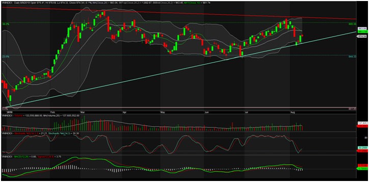 Kết phiên giao dịch ngày 9/8/2019, VN-Index chốt ở 974,34 điểm, giảm 0,9 điểm (-0,09%) với khối lượng giao dịch khớp lệnh đạt 134 triệu đơn vị, giá trị 2.910 tỷ đồng.