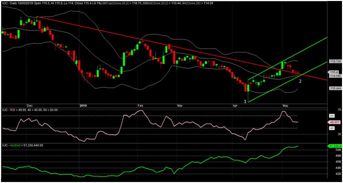 Các phiên giảm điểm hầu hết khối lượng giao dịch thấp và biên độ biến động trong phiên hẹp, cho xác suất những phiên tới cung sẽ khó áp đảo được cầu để duy trì trend xuống trong ngắn hạn. VJC đã thiết lập được điểm đầu của trend lên ngày 9/4/2019. Nếu đúng hôm 10/5 VJC đã tìm được điểm thứ 2 của trend lên này, thì rõ ràng nhỏ lẻ có thể tận dụng được, vào hàng loanh quanh đáy trend lên là có thể kiếm được lợi nhuận.