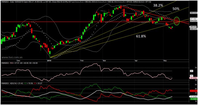 VN-Index phục hồi phiên cuối tuần với khối lượng giao dịch thấp, mặc dù đã lấy lại được mốc 950, nhưng VN-Index vẫn lằm dưới đường MA200 (955,4). Gap được tạo hôm 8/5 vẫn chưa được lấp đầy cho thấy rủi ro vẫn cao.