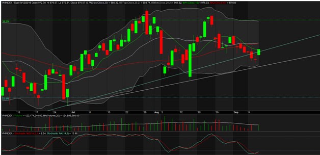 Kết phiên giao dịch ngày 12/9/2019, VN-Index chốt ở 976,07 điểm, tăng 6,76 điểm (+0,7%) với khối lượng giao dịch khớp lệnh đạt 123 triệu đơn vị, giá trị 2.779 tỷ đồng.