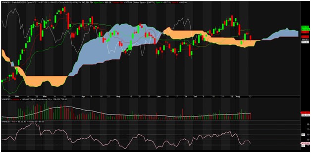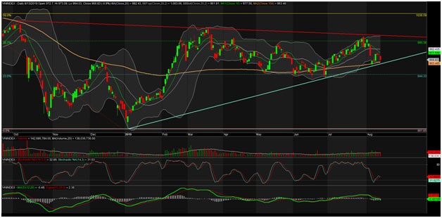 Cây nến hình thành xuất hiện bóng nến nhỏ phía dưới chứng tỏ bên mua cũng nỗ lực ngăn cản bên bán kiểm soát “cuộc chơi” ở một chừng mực nào đó. Sau phiên 13/8, chỉ số đã áp sát đáy kênh mà lần gần nhất (6/8) VN-Index đã không thể xuyên thủng. Nhưng những phiên sắp tới, cũng chưa thể biết được liệu kênh có đứng vững hay không. Tuy nhiên, xác suất trụ được chỉ tầm 50/50 trong bối cảnh hiện tại.