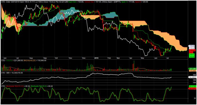CTD đang trong 1 xu hướng giảm từ đầu năm 2018 đến nay. Hiện tại, sau khi hồi phục từ đáy (96 -97), CTD tạo nền giá trong khoảng 9 phiên tầm 103 - 107 khá đẹp, 3 phiên gần nhất, khối lượng khớp lệnh luôn trên trung bình 20 ngày. Cho thấy sức hút hiện tại của CTD đã có sự thay đổi đáng kể. Hơn nữa, giá mới bật lên khỏi nền chưa quá xa, thậm chí CTD vẫn xanh bất chấp phiên điều chỉnh của VN-Index cuối tuần là khá mạnh mẽ.