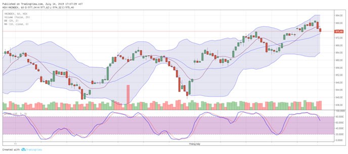 Ở khung thời gian này, 2 cây nến cuối cùng là khá xấu, tuy vậy đường MA20 vẫn chưa thủng cho thấy thực sự bên bán cũng chưa phải quá mạnh mẽ. Tuy nhiên, một vài chỉ báo khác đã cho tín hiệu hơi tệ gợi ý VN-Index có thể xuất hiện thêm nhịp rung lắc đầu phiên tới 14/7. Nếu vẫn không xuyên qua MA20 này (tầm 974), nguy cơ xuống tiếp là khá nhỏ.
