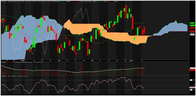 Nhiều chỉ báo lại xấu đi trông thấy điển hình như đường Stochastic, chỉ báo này đang hướng về khu vực quá bán gợi ý VN-Index sẽ vẫn phải chịu áp lực tiêu cực trong ngắn hạn. Kể cả với hệ thống Ichimoku, giá cũng chưa vượt nổi đường Tenkan và dường như đang muốn quay thẳng xuống xuyên thủng cả đám mây hiện tại ở khu vực 965-957.
