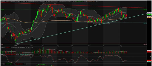 Kết phiên giao dịch ngày 14/8/2019, VN-Index chốt ở 968,91 điểm, tăng 2,08 điểm (+0,22%) với khối lượng giao dịch khớp lệnh đạt 125 triệu đơn vị, giá trị 2.685 tỷ đồng.