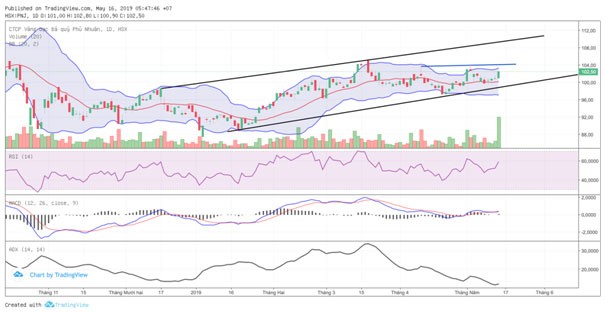 PNJ vẫn đang ở xu hướng lên. 15/5 PNJ đã có phiên đột biến khối lượng mạnh, dòng tiền lớn có dấu hiệu nhập cuộc. Đã 2 lần gần nhất PNJ không vượt nổi 104. Giá đã tiến sát BB upper, BB upper đang có dấu hiệu nở ra và nếu cây nến Gimme Bar như phiên 3/5 không xuất hiện nhiều khả năng PNJ sẽ hướng tới vùng giá 110. Ở chiều ngược lại, nếu giá thoát khỏi đáy kênh giá lên tầm 100, mức lỗ 3-4% là chấp nhận được.