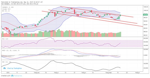 Kết phiên 15/5/2019, VN-Index chốt ở 975,64 điểm, tăng 10,3 điểm (+1,07%) với khối lượng giao dịch khớp lệnh đạt 154 triệu đơn vị, giá trị 3430 tỷ đồng. Như vậy, VN-Index đã tăng liên tiếp 4 phiên và gần như lấy lại được toàn bộ điểm số đã mất kể từ đầu tháng 5.