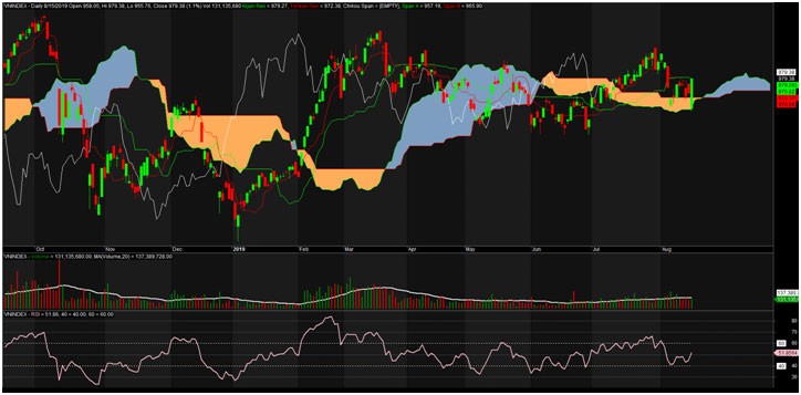 Kết phiên giao dịch ngày 15/8/2019, VN-Index chốt ở 979,38 điểm, tăng 10,47 điểm (+1,08%) với khối lượng giao dịch khớp lệnh đạt 131 triệu đơn vị, giá trị 2.796 tỷ đồng.