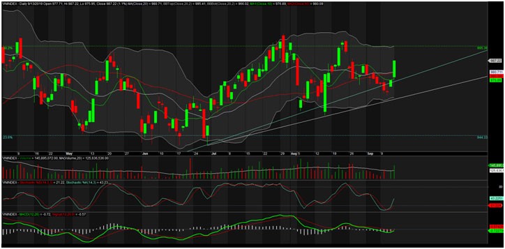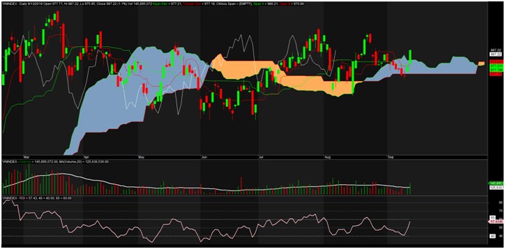 Kết phiên giao dịch ngày 13/9/2019, VN-Index chốt ở 987,22 điểm, tăng 11,15 điểm (+1,14%) với khối lượng giao dịch khớp lệnh đạt 146 triệu đơn vị, giá trị 3.334 tỷ đồng.