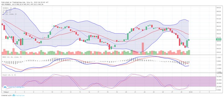 VN-Index chạm BB bottom và nhanh chóng bị dội ngược lại, tạo cây nến khá tích cực nhưng vẫn chưa vượt qua MA20 (953,6). Cầu giá thấp khu vực 940 tiếp tục bị thử thách thêm, để lại một bóng nến dài gợi ý bên mua cuối cùng đã chiến thắng mặc dù lúc đầu bị bên bán áp đảo hoàn toàn.