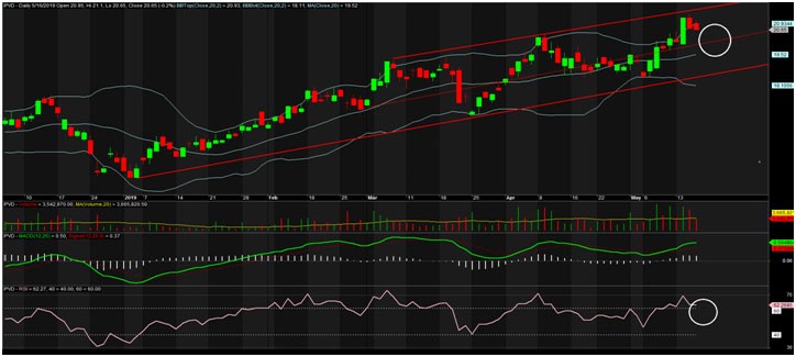 PVD đang dao động trong 1 xu hướng lên như trên đồ thị được vẽ. Giá đã chạm kênh trên ngày 15/5, hiện đang bị dội ngược lại về phía giữa kênh (tầm 20).