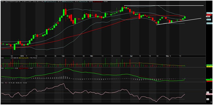 VEA có giá đang nhích dần từng chút một, nhưng khá vững chắc. Khối lượng tăng dần theo từng phiên. Các chỉ báo như MACD, RSI đều khá ổn. Trong khi dải BB upper đang có dấu hiểu nở ra. Tuy nhiên, ngay mức giá 49,6 đang có đường MA50 án ngữ. Nếu vượt qua MA50 này, cửa đi tiếp của VEA là khá cao. Cắt lỗ dưới 47, mục tiêu tầm 53.