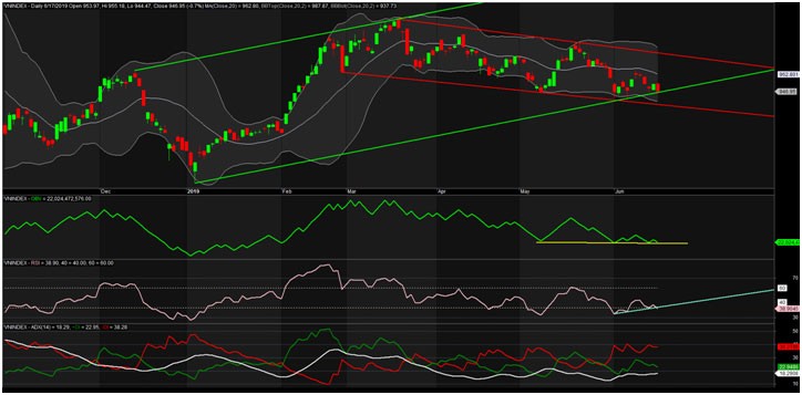 Trên đồ thị, cũng chưa có gì đột biến so với những phân tích từ những phiên trước khi giá vẫn nằm trong các kênh chính được vẽ, rất may là chưa kênh nào thủng, nhóm các chỉ báo động lượng khá xấu, xung lực tăng của VN-Index yếu khi các chỉ báo như RSI, hay Stochastic, MACD đều cho thấy chỉ số còn phải chịu áp lực giảm trong ngắn hạn. Mặc dù phiên 17/6 giảm khá nhưng chỉ báo OBV cũng chưa quá xấu, MFI còn duy trì đi ngang. Các chỉ báo xu hướng như ADX đang xấu dần lên, ADX đang tiếp cận mốc 20, nếu ADX vượt mốc này, xu hướng xuống hiện tại sẽ còn mạnh nữa.