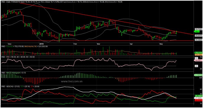VND hồi phục từ đáy (15,3) gần nhất ngày 6/5 tầm 9%. Mức tăng mạnh hẳn hơn VN-Index khá nhiều (chỉ hồi phục tầm +3,3%), nhưng khá chắc chắn.