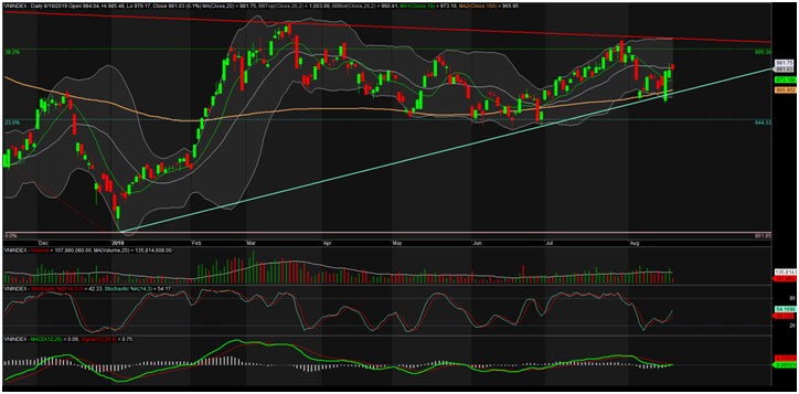 Kết phiên giao dịch ngày 19/8/2019, VN-Index chốt ở 981.03 điểm, tăng 1.03 điểm (+0.11%) với khối lượng giao dịch khớp lệnh đạt 108triệu đơn vị, giá trị 2.440 tỷ đồng.