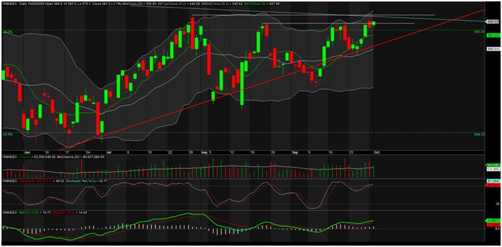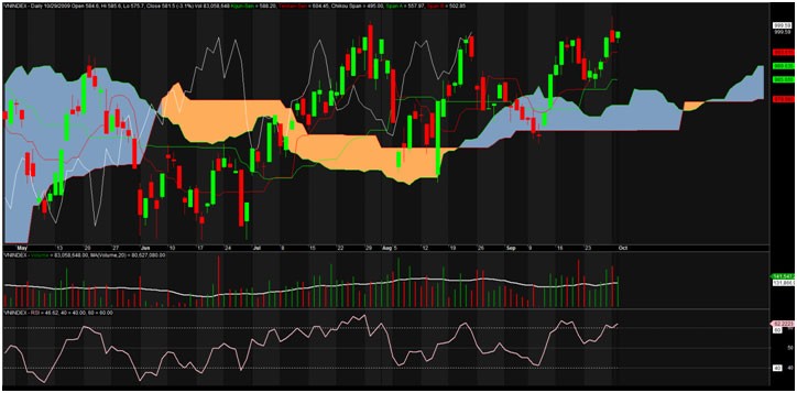 Mặc dù tăng không nhiều nhưng trên đồ thị VN-Index vẫn vượt qua đỉnh 998,67 của tháng 8 và áp cực sát ngưỡng 1.000 điểm với khối lượng duy trì tốt. Tuy chưa thể vượt, nhưng cũng phần nào làm suy giảm các dấu hiệu tiêu cực của cây nến hôm 30/9.