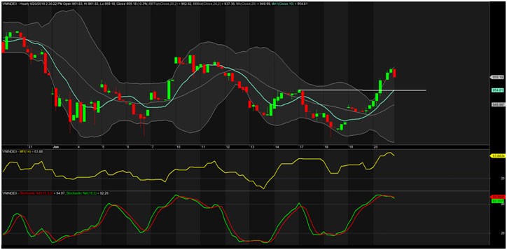 Tuy nhiên, nếu kỹ hơn, xem xét chart 1 hour (1 giờ) sẽ cho ta cái nhìn chi tiết hơn với VN-Index. Quan sát nến cuối cùng của chỉ số thì nhận ra dường như lực bán ra đã tăng mạnh trong phiên ATC. Cộng thêm một vài chỉ báo như stochastick, RSI, MACD histogram đều cho tín hiệu đảo chiều. Điều này cảnh báo nhiều khả năng sẽ có rung lắc ở phiên 21/6, nhưng nếu chỉ số giữ được mốc 955 điểm thì cũng không có gì quá lo ngại.