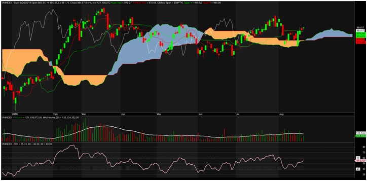 Kết phiên giao dịch ngày 20/8/2019, VN-Index chốt ở 984,67 điểm, tăng 3,64 điểm (+0,37%) với khối lượng giao dịch khớp lệnh đạt 121 triệu đơn vị, giá trị 2.792 tỷ đồng.