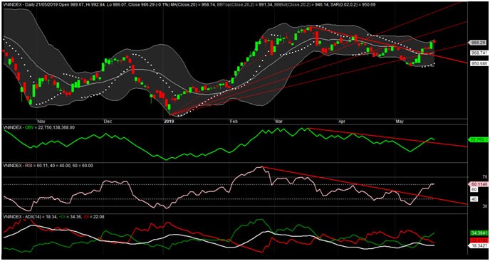 Kết phiên giao dịch 22/5/2019, VN-Index chốt ở 986,29 điểm, giảm nhẹ 0,84 điểm (-0.,09%) với khối lượng giao dịch khớp lệnh đạt 125 triệu đơn vị, giá trị 3.024 tỷ đồng.