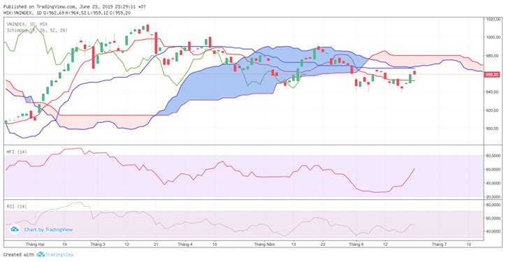 Quan sát chỉ số với chỉ báo ichimoku thì thách thức của VN-Index vẫn còn khá nhiều. Chỉ số vẫn nằm dưới đám mây hàm ý xu hướng xuống hiện tại vẫn là chủ đạo. Trong khi tín hiệu mua mạnh nhất khi Taka-sen cắt đường Kijun - sen hướng lên chưa xuất hiện. VN-Index cũng chưa vượt qua được đường Kijun-sen, cũng đồng thời ngang tầm đỉnh gần nhất (966-967). Tuy nhiên, đám mây đang khá mỏng, do vậy khu vực kháng cự tạo bởi đám mây này chỉ tầm khoảng loanh quanh 15 điểm, không quá khó để vượt qua.