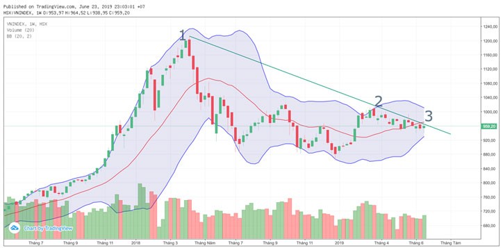 Chỉ số hiện đang tiếp cận kênh xuống được vẽ từ đỉnh lập tháng 4/2008. Sau khi vị trí số 2 tầm giữa tháng 3 được xác nhận thì suốt mấy tháng nay không tuần nào chỉ số có thể vượt qua kênh giá này. Rõ ràng ở vị trí số 3, VN-Index nếu vượt được luôn cả MA20 tầm 970 điểm thì kênh giá này sẽ bị phá vỡ. Chỉ số sẽ chính thức thoát khỏi trend giảm đeo bám suốt mấy tháng nay.