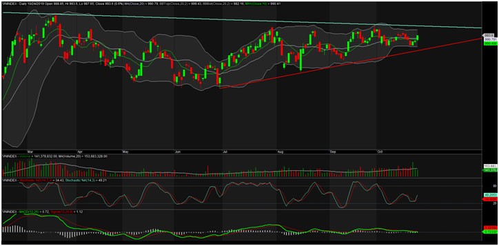 Kết phiên giao dịch ngày 24/10/2019, VN-Index chốt ở 993,6 điểm, tăng 5,81 điểm (+0,59%) với khối lượng giao dịch khớp lệnh đạt 141 triệu đơn vị, giá trị 3.046 tỷ đồng.