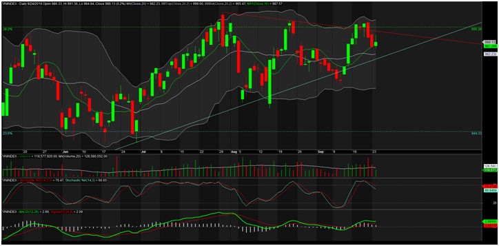 Kết phiên giao dịch ngày 24/9/2019, VN-Index chốt ở 988,13 điểm, tăng 2,38 điểm (+0,24%) với khối lượng giao dịch khớp lệnh đạt 120 triệu đơn vị, giá trị 2.673 tỷ đồng.