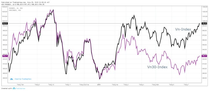 Kết phiên giao dịch ngày 25/7/2019, VN-Index chốt ở 994,95 điểm, tăng 6,54 điểm (+0,66%) với khối lượng giao dịch khớp lệnh đạt 141 triệu đơn vị, giá trị 3.244 tỷ đồng.