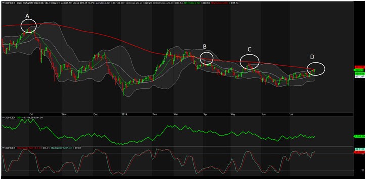 Rõ ràng, khi xem xét 2 đồ thị thì cứ mỗi khi VN30 gặp đường MA200 và đảo chiều thì VN-Index cũng đảo chiều theo. Những dấu hiệu này gợi ý, nhà đầu tư cũng cần phải quan sát kỹ chỉ số VN30-Index, nhất là tại những mức cản quan trọng của chỉ số này. Cho nên, nếu VN30 không vượt qua MA200 tầm 891-892 điểm, thì xác suất VN-Index đảo chiều sẽ tăng lên đáng kể.