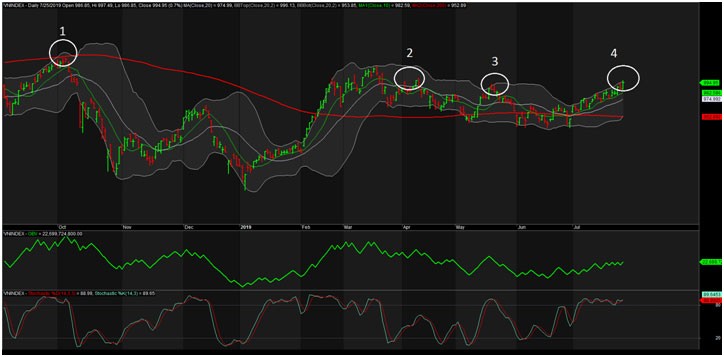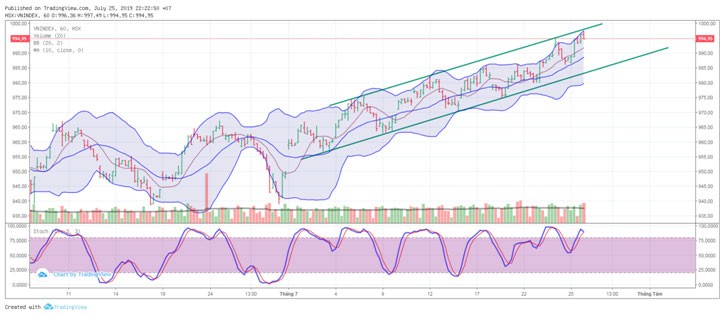 Sau phiên 25/7 thì đỉnh gần nhất (992,84) chính thức bị phá vỡ, ngưỡng kháng cự tiếp theo chỉ số cần chinh phục sẽ là đỉnh của tháng 4 tầm 1.000 điểm. Khoảng cách 5 điểm không có gì là quá khó để đạt được. Chỉ cần duy trì đà tăng được như phiên 25/7 nhà đầu tư sẽ sớm được nhìn thấy điểm số 1.000 điểm của VN-Index.