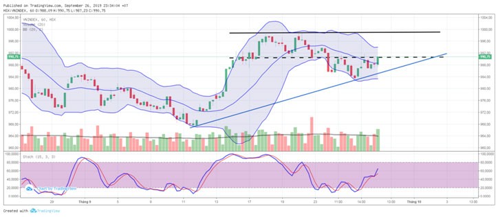 Kết phiên giao dịch ngày 26/9/2019, VN-Index chốt ở 990,75 điểm, tăng 3,45 điểm (+0,35%) với khối lượng giao dịch khớp lệnh đạt 133triệu đơn vị, giá trị 3.108 tỷ đồng.