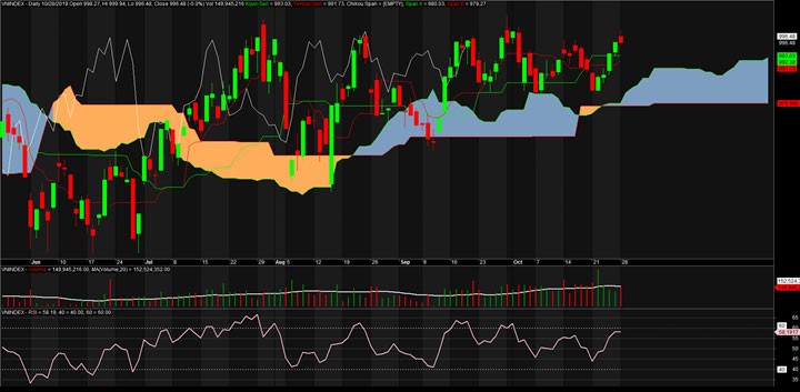 Kết hợp với hệ thống Ichimoku thì nhiều khả năng VN-Index sẽ tiếp tục điều chỉnh nhẹ về quanh 993 để kéo đường Tenkan dịch chuyển lên phía trên vừa đủ cắt lên Kijun và đồng thời bám sát các mức Low của các cây nến.