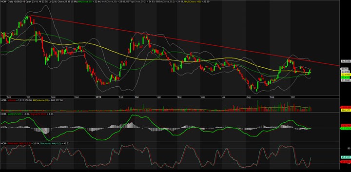 HCM đang phục hồi từ mức đáy gần nhất tầm quanh giá 22. Cổ phiếu này nhìn chung vẫn có thể điều chỉnh sau phiên hôm nay 28/10 về tầm 22,5 trước khi quay lại nhịp hồi phục trước đó. Trên đồ thị, HCM vừa vượt qua MA20 không quá xuất sắc nhưng vẫn vừa đủ tạo ra 1 giao cắt đẹp.