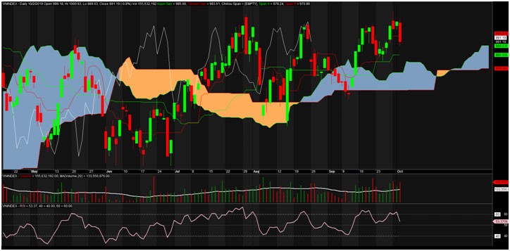 Với hệ thống Ichimoku, giá bất ngờ xuyên qua đường Tenkan hướng xuống kéo theo một vài chỉ báo khác bớt đẹp, điển hình là đường Chikou Span đã quay lại dưới đường giá và ở khu vực mây tương lai, SpanA và SpanB đã có dấu hiệu đi ngang báo hiệu nhịp tăng đã chững lại. Nhưng nhìn chung, hệ thống Ichimoku vẫn chưa đến nỗi nào sau phiên lao dốc mạnh hôm nay của VN-Index.
