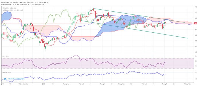 Phiên 2/7, VN-Index vẫn chưa vượt qua đỉnh gần nhất. Ngưỡng cản ngắn hạn (967) mới được thiết lập ngay trong tháng trước tưởng đơn giản mà hóa ra lại là khó. Hơn nữa, kênh giảm giá từ giữa tháng 3/2019 vẫn đang đúng, phần nào làm cả bên bán và mua đều phải cân nhắc khi VN-Index tiệm cận đỉnh kênh này.
